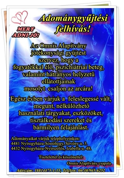 Az Omnis Alapítvány egész évben gyűjtést szervez fogyatékkal élő, valamint pszichiátriai beteg ellátottjai számára. Ami Önnek felesleges, az másnak kincset ér! Amennyiben rendelkezik feleslegessé vált ruházattal, bútorzattal, használati tárgyakkal, vegye fel velünk a kapcsolatot. Bárminemű felajánlást szívesen fogadunk. A természetbeni támogatásról természetesen igény esetén igazolást állítunk ki.